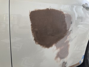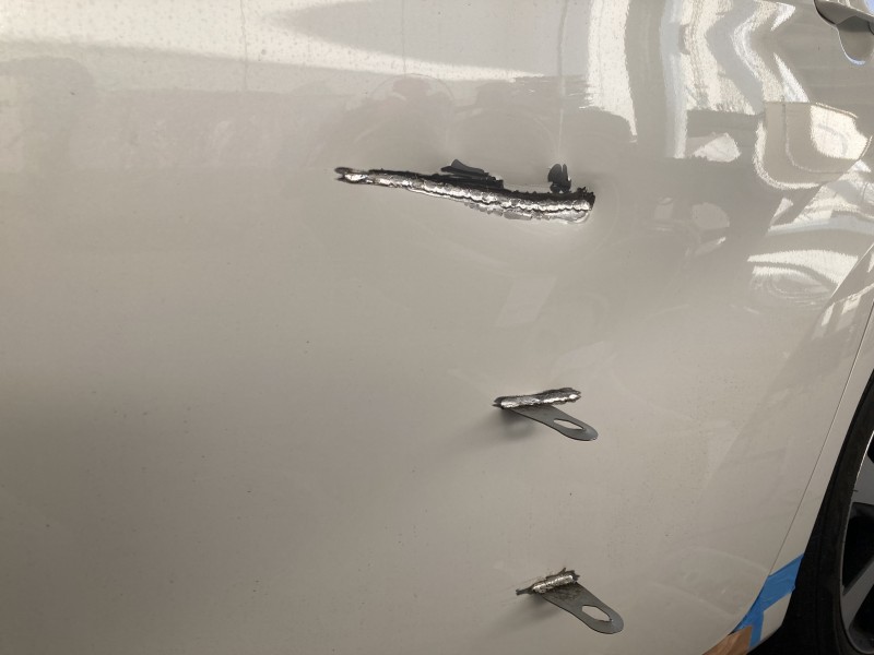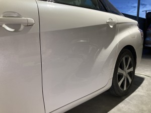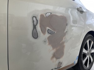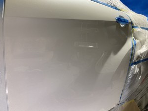 まずは、へこみ修正 板金作業が終わりパ手盛り削りの繰り返しで形の修正 スプレーパテを塗布し最後の形修正 成形作業を終えて次はサフェーサー塗布 下地処理をしていよいよ色塗り 最後にしっかりと磨き上げて終了です